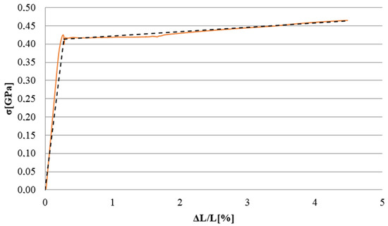 The numerical model was developed in Abaqus (Abaqus 2019, Dassault Systemes Simulia Corporation, Velizy Villacoublay, France). The experimentally analysed sigma shaped beam was described with a discrete model, where the tested profile was subjected to numerical analysis of the beams subjected to bending, due to the applied loads [7,25]. The finite element model of the sigma steel beam, respectively, for the laboratory tests, is made of shell finite elements (linear shape function). With reference to the numerical model, both the steel washers and steel support clamps, cooperating with the steel beam reinforced with composite tapes, were made of non-deformable shell finite elements. Inside the beam profile, at the opposite ends of the profile, there were channel profiles made of steel to reduce local deformation of the beam profile. The C-profile was made as a shell finite element with a defined thickness. The material model within the discrete model was prepared on the basis of information from experimental tests [9]. On the basis of the σ-ε relationship obtained in laboratory coupon test, the bilinear elastic–plastic material model with strain hardening was adopted in the FEM numerical model. The material properties were as follows: Young’s modulus (201.8 GPa), Poisson’s ratio (0.282), and yield strength (418.5 MPa) (Figure 11). The lower value of Young’s modulus than for the S350 GD steel grade results from the fact that the samples are made of galvanised steel.