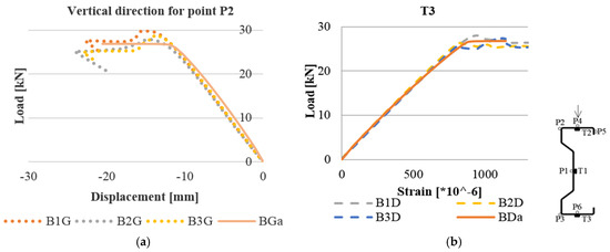 A detailed analysis of the obtained test results was carried out mainly in places where electrofusion strain gauges T2 and T3 were initially placed, regarding the laboratory tests (the locations of strain gauges are shown in Figure 13b). The strain level that was read in the laboratory tests was directly compared with the results of numerical calculations, precisely with Max. In-Plane Principal (Abs) from Abaqus. These are components illustrating strains in the longitudinal direction of the beam in the plane of the individual walls of the section. In the numerical analysis, vertical displacements and horizontal displacements of the beams were reported at the points where measurements were made during laboratory tests. Examples of strain and deformation comparison of selected beams are presented in Figure 13a,b.