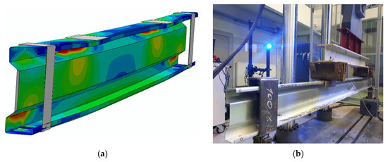 Measuring points with a diameter of 5 mm were placed on the beam walls, (Figure 4a), which allowed for preliminary measurements of geometric imperfections [23] using the Tritop system. Moreover, they were used to create a common coordinate system for the two measuring lenses in the Aramis system [24]. These points were also used to analyse the displacements of the tested beams in the GOM Correlate program (GOM, GmbH, Braunschweig, Germany). As it was mentioned before, the conducted research used optical 3D coordinate measuring machine—Tritop. It is a portable system enabling precise and quick measurements of 3D coordinates of objects. A series of accurate photos of each of the tested beams was taken using a camera. The photos were transferred to the GOM Correlate program and measurements of individual beam dimensions were made. Section height, top flange width, and bottom flange width were monitored. All measured values were within dimensional tolerances (1 mm for height and 0.5 mm for width). Therefore, in the numerical study the impact of imperfection was neglected. Rules of application and use of the Aramis and Tritop system are in details described in [18].