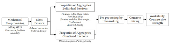 The experimental program, see Figure 1, is commenced with mechanical pre-processing alternative for individual fractions followed by an assessment of adhered mortar loss and material damage on a single batch sample. The properties of individual and combined fractions are investigated on pre-processed CCA. Investigated properties and samples per test covered in Section 2.2.