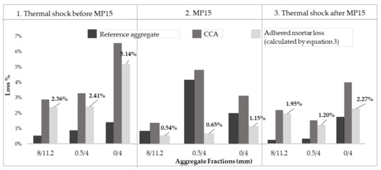 Assessment of adhered mortar loss is a way to measure the effectiveness of the pre-processing alternatives of 10 and 15 min. Mechanical pre-processing is pursued separately for each CCA and reference aggregate fraction and is followed up by related operations washing and sieving. CCA may undergo both loss of material and adhered mortar, whereas reference aggregates undergo a loss of material. Therefore, the actual amount of adhered mortar removed from CCA by mechanical pre-processing is the material loss in reference aggregates deducted from the CCA loss as shown in Equation (2).