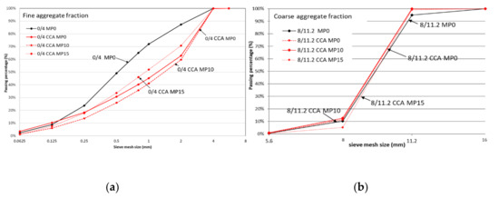 The coarse CCA grading curve, Figure 3b, is not markedly influenced by MP10 or MP15, maybe because its higher density resists significant abrasion by mechanical pre-processing. Another study shows noticeable effect on the course fraction grading with pre-processing like autogenous cleaning as it is a low-density CCA [8].