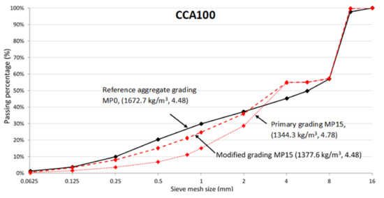 The closeness of the modified CCA grading and reference aggregate grading is validated by the fineness modulus, seen in Figure 4 and Table 5. After pre-processing MP15, the fineness modulus of CCA with primary grading is 4.78, already close to reference aggregate grading 4.48. However, the fineness modulus of CCA after modified grading is 4.48, an excellent match to reference aggregate grading.