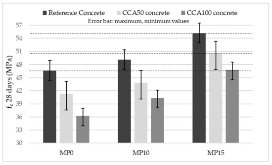 The influence of the packing density on the compressive strength of concrete is initiated by a comparison of packing density with the concrete density, measured at 28 days just before the compression strength is carried out, shown in Table 6. The concrete densities of CCA50 and CCA100 increase correspondingly with the packing density as the pre-processing duration is prolonged. The concrete density is the highest at MP15 as is the packing density; however, a similar trend is not observed for reference concrete where concrete density increases despite reducing packing density. This is because the packing density in this study addresses aggregates in an un-compacted condition, whereas the apparent density and concrete density on the other hand are measured in a compacted condition. The concrete density may increase without an increase in the packing density also because of the reduced flakiness of coarse reference concrete aggregate 8/11.2 mm contributing to a more effective compaction of the fresh concrete [24].