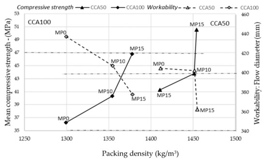 The packing density is derived from the weighed unit weight of the aggregate fractions in the concrete mix. The packing density is also influenced collectively by aggregate density, flakiness index, shape index, particle grading, unit weight, and void content. Therefore, the changes arising in these properties from mechanical pre-processing affects the packing density. The property majorly affecting packing density is the change in the unit weight and particle grading of mechanically pre-processed aggregates, seen in Table 4. The highest packing density is observed for MP15 for both CCA50 and CCA100.