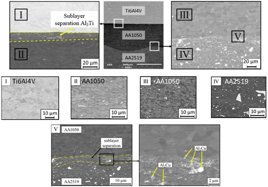 Metallographic cross-sections obtained with scanning electron microscopy of the manufactured laminate AA2519-AA1050-Ti6Al4V.
