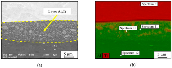 In the case of the border of the titanium alloy Ti6Al4V with the 1050 aluminum alloy, an intermediate layer was observed with a thickness of approximately 8–15 µm (Figure 3a). In this layer, the presence of numerous precipitates of various sizes and irregular shapes was found. To identify the chemical composition of materials in the diffusion layer, an energy-dispersive spectrometry (EDS) analysis was performed (Figure 3b).