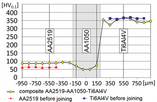Microhardness measurements were carried out with a Struers DURA SCAN 70 metallographic microhardness tester (Struers Inc, Cleveland, OH, USA) with the Vickers method in accordance with the methodology included in the standard PN-EN ISO 6507-1:2007. The obtained results of the microhardness measurement of the AA2519-AA1050-Ti6Al4V alloys in the connection area, including the microhardness of constituent materials before the connection, are presented in Figure 4.