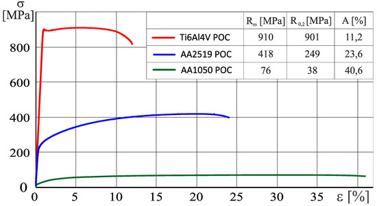 Advantageous mechanical properties, good weldability, high corrosion resistance and a melting point temperature of 1955 K indicate that titanium alloys can be extensively used in the aerospace, space and military industries. The Ti6Al4V alloy is also characterized by increased ballistic resistance that makes it an alternative material to those used for homogeneous armor plate productions [35]. The specific properties of the Ti6Al4V alloy allow its use in the production of aircraft components, including jet engine rotor blades and wing caissons [36]. The strength properties of Ti6Al4V alloy were obtained on the basis of our own research. The chemical composition of the material was given by the manufacturer. The data are presented in Table 2.