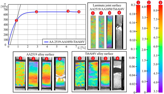 The theoretical tensile strength was determined on the basis of the mixtures law for Rmk = 604 MPa. The obtained test results carried out on the produced laminates indicate that the tensile strength of the AA2519-AA1050-Ti6Al4V laminate is Rm = 657 MPa (Figure 7). Explosive bonding increased its strength by >8%. The observed increase in the Rm value was influenced by the strengthening of the constituent material caused by the crushing during the evolution of the explosive bonding process. Another factor that increases tensile strength is the formation of Al3Ti intermetallic phase materials in the intermediate layer [41,42]. Owing to the diffusive nature of the Al-Ti joint formation process and the thermo-mechanical processes, elements are segregated in a very narrow area of the transition zone. This results in a local change in mechanical properties. These factors in conjunction with the layered structure of the produced composite can have a significant impact on the different values of the material deformation. Verification of the laminate surface deformation process in a monotonic tensile test was carried out with the use of the digital image correlation (DIC) method. Deformation observations were carried out from the three sides of the laminate, namely the aluminum alloy, titanium alloy and side sample surfaces. The tests results are shown in Figure 7.