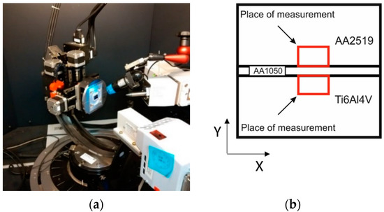 X-ray stress tests were carried out in cooperation with the Institute of Metallurgy and Materials Engineering of the Polish Academy of Sciences in Krakow. The tests were conducted on a Bruker D8 Discover X-ray diffractometer (Bruker AXS GmbH, Karlsruhe, Germany) with a Euler wheel (Bruker AXS GmbH, Karlsruhe, Germany) and a sample positioning table (Figure 8).
