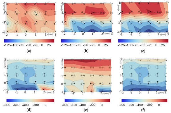 X-ray stress measurements were carried out on the surface of the cross-sections of the sample. Measurements were made locally at various points (separated by 1 mm distances) on the surface (area of 25 mm2) in accordance with Figure 9. During the tests, standard residual stress measurements were made according to the sin2ψ method using a scintillation detector in a parallel beam system with a Soller 0.34 collimator. The Texture-aided Residual Stress Investigation System software package (TARSIuS) was developed by Professor Bonarski and Mr. Kania from the Institute of Metallurgy and Materials Science of the Polish Academy of Sciences. The software regulates the analysis process of the tested samples, including the application of direct control of the diffractometer during measurements, or the automatic processing of partially acquired results and the visualization of the final results in the form of stress maps. The identified residual stresses in the tested samples are compressive and tensile. To facilitate the interpretation of the stress values, two-dimensional maps are presented separately in the graphical form of the tested composites’ measurements (Figure 9). Measurements for the AA2519 alloy are shown in Figure 9a–c, and for the Ti6Al4V alloy in Figure 9d–f.