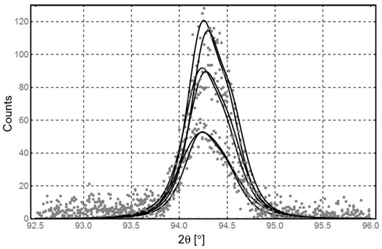 In the composite formed after explosive welding, the topographies of the main stresses in the titanium and aluminum layers are characterized by their laminar natures that are determined by the interaction of both composite component layers. The titanium layer is characterized by considerably increased stress values (up to −800 MPa) compared with the aluminum layer (up to −100 MPa). The closer the titanium layer is to the intermediate layer, the more profound is the increase in the compressive stress. Near the AA1050 alloy layer, compressive stresses are transformed into tensile owing to the shear forces that increase the effect generated by the crystal lattice mismatches in the two joined materials. The intermediate results obtained for one of the directional stress measurements in this alloy are illustrated in Figure 10. The recorded peaks differ significantly in intensity, and the obtained dhkl relations are neither linear nor elliptical.