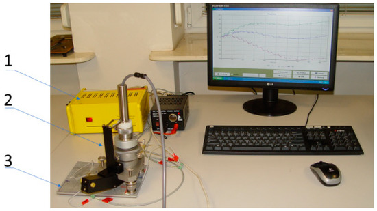 Stand for residual stress measurements: Esam Traveler Plus strain gauge bridge with a power supply (1), RS-200 device (2) and tested material (3).