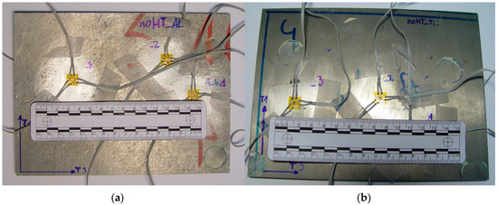 Residual stress measurements were carried out on the produced laminate from the titanium and aluminum alloy sides. The preparation of the surface before the installation of the strain gauge rosettes was carried out based on the guidelines contained in the Instruction Bulletin B-129-8 Surface Preparation for Strain Gauge Bonding, which included the degreasing of the aluminum and titanium surfaces and grinding. The prepared surfaces were stripped of oxides with Conditioner A, and were then neutralized with Neutralizer 5A, which allowed the application of strain gauges. The measurement methodology has been developed for the ASTM Standard Test Methods E 837. It included the attachment of at least three strain gauges with cable installations on each type of tested surface. The EA-13-062RE-120 rosettes were used for the aluminum alloy, while the EA-05-062RE-120 rosettes were used for the titanium alloy. The next step was to drill holes (with a diameter of 1.6 mm and a maximum depth of 2.0 mm) in designated measurement locations at 0.1 mm increments. Voltage signals from strain gauges were amplified by means of the Esam Traveler Plus-type 1032-S Strain Gauge Bridge. Residual stresses and their angular orientations were determined on the basis of measured strain values. Figure 12 shows the emplacement of strain gauges on plates of the laminate produced for the needs of conducting tests using the hole trepanation method.