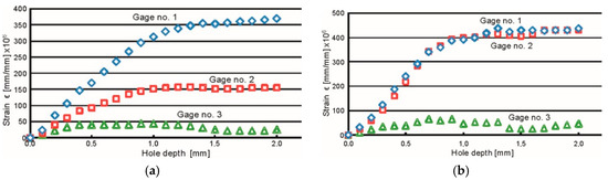 Graphs of strain changes depending on the hole depth on the AA2519 side (a) and on the Ti6Al4V alloy side (b) of the AA2519-AA1050-Ti6Al4V laminate.