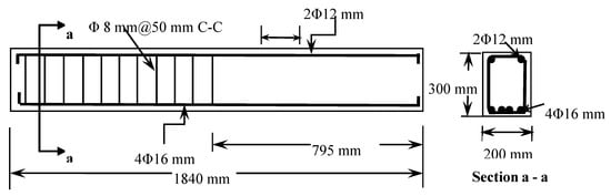 Figure 1 shows the longitudinal section of the beam with reinforcement details. Stirrups, as shear reinforcement, were provided on one side of the beam while the other side was not reinforced with stirrups and therefore it is shear deficient. As shown in Figure 1, the beam specimen dimensions are 1840 × 200 × 300 mm. Figure 1 also shows the cross section of the beam with reinforcement details. As shown, the beams were reinforced in flexure with 4Ø16 mm bars in the tension zone located at 259 mm from the top of the beam. In the compression zone, the beam specimen is reinforced with 2Ø12 mm bars. Each beam was internally reinforced against shear using stirrups of Ø8 at 50 mm center to center as shown in Figure 1.