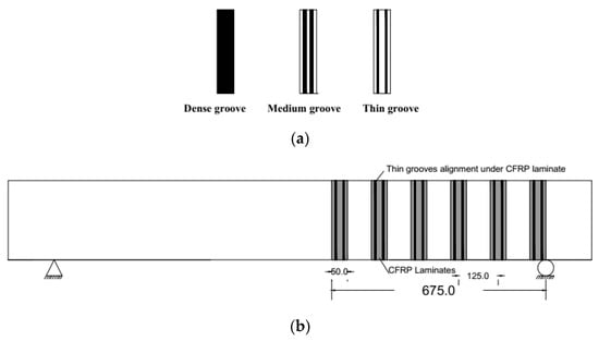 CFRP laminates and grooves alignment (all dimensions are in mm); (a) all groove types; (b) grooves on beam stem.