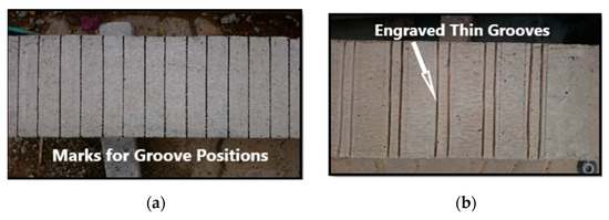 For the beams strengthened with EBR the beam surface was cleaned with a brush, place where the CFRP laminates will be attached was marked, a concrete grinder machine was used to remove the thin layer of weak concrete on the sides of the beams to make a rough surface for bonding the CFRP sheet and plates, then an air blower was used to remove all the dust. The wet layup method was then used for bonding the CFRP sheet and plates into the prepared concrete surface by applying a film of an appropriate resin (Mapewrap 31 and Adesllesx PG2) before laying the FRP. The fibers were finally saturated by applying enough resin. Excess resin was removed from the surface to prevent its adverse effect on ultimate rupture strength. For beams strengthened with groove-epoxy anchorage system, the thin, medium, and dense grooves were marked and engraved only on the beam’s sides (beam stem) using the grinder (Figure 4a–c). The grooves were filled with epoxy adhesive and then an epoxy layer of approximately 2 mm was used. Finally, the CFRP sheet or plate was attached on top of the epoxy layer (beam’s sides) and were impregnated with another layer of epoxy adhesive (Figure 4d). The specimens were left to cure for 7 days waiting for the epoxy to gain its full strength prior to testing.
