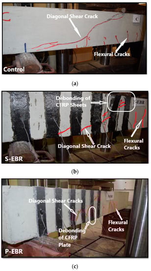 Failure modes: (a) Diagonal shear crack on the control beam; (b) debonding of CFRP sheets in S-EBR; (c) debonding of CFRP plates in P-EBR.