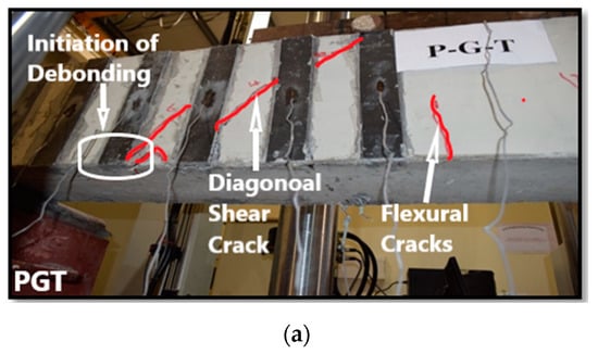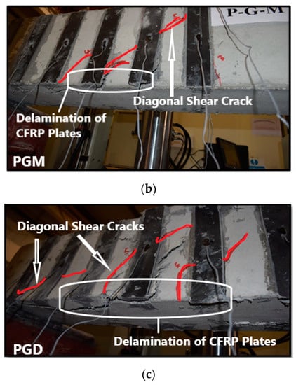 The PGT beam was strengthened in shear with CFRP plates using groove-epoxy anchorage with two thin grooves. It failed in shear with a diagonal tension crack experiencing higher load and displacement compared to control beams. The ultimate load was 241.68 kN with a deflection of 8.77 mm, which is 106.63% higher than the control beam as shown in Table 3. At the onset of failure, diagonal crack passed under CFRP plate number 2 and 3 and delamination of CFRP plate number 2 happened, as shown in Figure 8a. The PGM beam was strengthened in shear with CFRP plates using groove-epoxy anchorage with two medium grooves. It failed in shear with a diagonal tension crack experiencing higher load and displacement compared to the control beam. The ultimate load was 248.30 kN with a deflection of 7.79 mm (Table 3), which is 112.29% higher than the control beam. It also showed larger attained load than the PGT sample, which means that the groove width has an effect in delaying debonding. At last, because of the weak interface between the CFRP plates and concrete beam, diagonal crack passed under CFRP plate number 2 and 3 and delamination of CFRP plate number 2 happened as shown in Figure 8b. The PGD beam was strengthened in shear with CFRP plates using groove-epoxy anchorage with one dense groove. It failed in shear with a crack that started from the load point and went through the top of the beam until it reached the third CFRP plate, then it went down diagonally and continued through the bottom until it reached the beam’s edge, experiencing higher load and displacement compared to the control beam. The ultimate load was 176.30 kN with an associated deflection of 7.72 mm (Figure 8), which is 50.74% only higher than the control beam but less than PGT and PGM. Thus, two thin or medium groves performs better than one dense groove in delaying plate debonding. Eventually, delamination of CFRP plates 2 and 3 happened, as shown in Figure 8c.