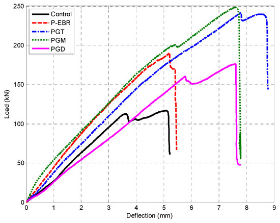 Figure 9 shows the load-deflection relationship for the beams with groove-epoxy anchorage systems using CFRP plates (PGT, PGM and PGD). The thin and medium grooves achieved the maximum load and slightly more deflection among the three specimens that were strengthened with groove-epoxy, as shown in Figure 9. All the beams that used groove-epoxy anchorage systems consistently showed higher strength than that of the conventional EBR strengthening method.