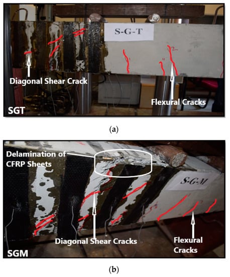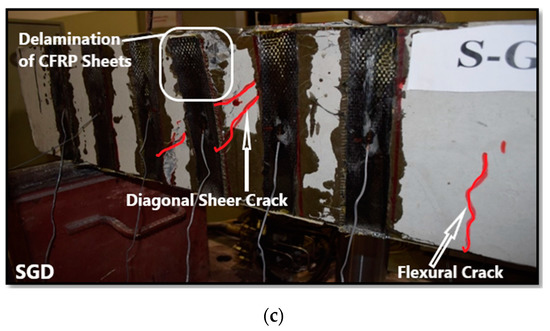 - All specimens failed in shear with a major diagonal shear crack, followed by CFRP sheets or plates debonding, or delamination and some combination of small flexural and flexural-shear cracks.