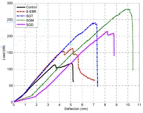 Figure 11 shows load and deflection relationship for the beams with groove-epoxy anchorage strengthening method using CFRP sheets (SGT, SGM and SGD). The sheets with medium grooves achieved the highest attained load along with the highest associated deflection among the three specimens, which proved that there is an optimum size for the groove’s effectiveness. Nevertheless, all the beams that used groove-epoxy anchorage system achieved higher strength compared to the beam with conventional EBR method.