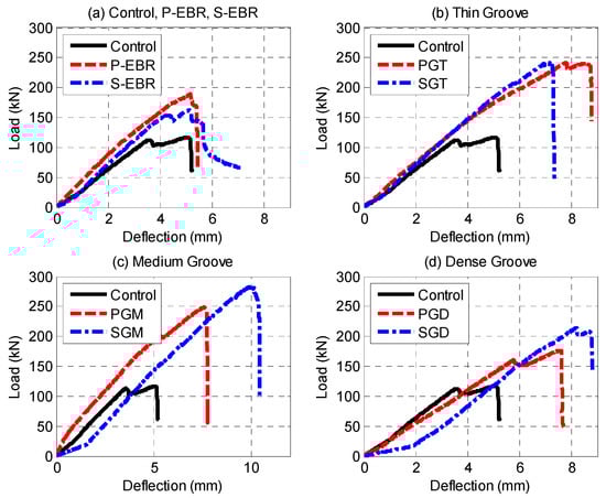 Load-deflection curves: (a) Control, P-EBR, S-EBR; (b) Thin grooves; (c) Medium grooves; (d) Dense grooves.