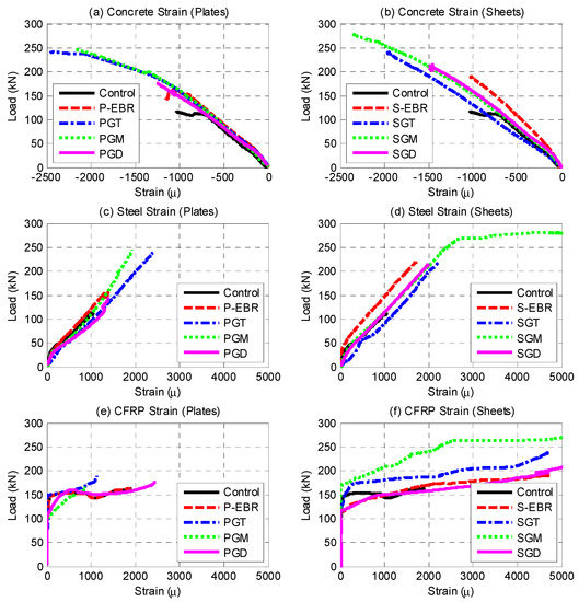 Load-strain relationships for concrete, steel and CFRP laminates: (a) Concrete strain (Plates); (b) Concrete strain (Sheets); (c) Steel strain (Plates); (d) Steel strain (Sheets); (e) CFRP strain (Plates); (f) CFRP strain (Sheets).