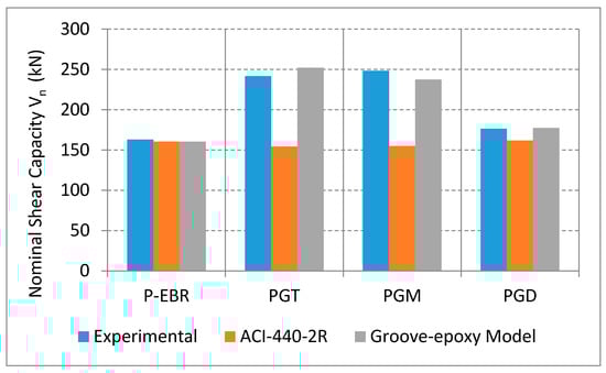 Table 5 illustrates the experimental shear strength (Vexp) and the theoretical shear strength at different strain levels. ACI equations use () as a limit for the strain used to predict the shear strength. The shear strength is also calculated using the strain values obtained from the CFRP strain gauges. All these predicted values were less than the experimental ones, therefore, higher strain values were used to calculate the shear strength (3000 and 6000 μstrain). Figure 15 represents the experimental and the model predicted shear strength values for P-EBR, GT, PGM, and PGD beams as well as those using the ACI equation with strain limit. It has been observed that the actual shear strength valued falls between strain values of 3000 to 6000 μstrain, which means that the ACI limit () needs to be adjusted when using the groove-epoxy anchorage system with CFRP plates.