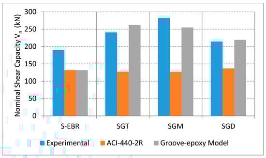 Table 6 illustrates the experimental, the ACI and the model predicted shear strength values. The ACI value was based on the imposed strain limit of . It is observed that the predicted values were less than the experimental ones, therefore, higher strain values were used to calculate the shear strength (2500 and 4500 μstrain). Figure 16 represents the experimental and the model predicted shear strength values for S-EBR, SGT, SGM, and SGD beams as well as the ACI ones using the ACI equation with the strain limit. It can be deduced that the actual shear strength values falls between strain values of 2500 and 4500 μstrain, which means that the ACI limit () needs to be increased when using groove-epoxy anchorage system with CFRP sheets. Therefore, the proposed models, with groove-epoxy factors, could be used to predict the shear capacity of the strengthened specimens with a reasonable level of accuracy.