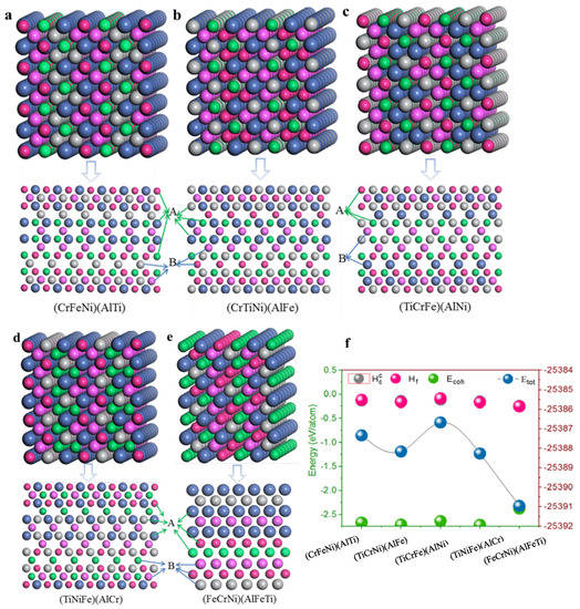 Schematic representation of crystal cell, (110) plane for single-phase AlCrTiFeNi of different atom occupancy positions (‘A’ and ‘B’ represent the atoms position in parentheses: (a) (CrFeNi)(AlTi); (b) (CrTiNi)(AlFe); (c) (TiCrFe)(AlNi); (d) (TiCrFe)(AlCr); (e) (FeCrNi)(AlFeTi); (f) The calculated total energy , formation enthalpy , cohesive energy , and secondary solid solution formation enthalpy .
