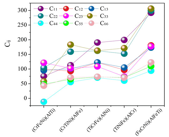The elastic constants predicted by the first-principles calculations and Born stability criteria [39] are directly applied in the present structural stability analysis. The calculated elastic constants for AlCrTiFeNi are listed in Figure 3. If the values of () and () are very large, suggesting that it is difficult to compress the AlCrTiFeNi alloy under the uniaxial stress along the X () or Z () axis. As shown in Figure 3, it can easily be seen that, with the exception of the (CrFeNi)(AlTi) atom occupancy positions, the calculated (Cij) for single-phase (TiCrNi)(AlFe), (TiCrFe)(AlNi), (TiCrFe)(AlCr), and (FeCrNi)(AlFeTi) atom occupancy positions satisfy the Born stability criteria, suggesting that the crystal structure of (CrFeNi)(AlTi) atom occupancy positions are mechanically unstable and hard to be formed, while the (TiCrNi)(AlFe), (TiCrFe)(AlNi), (TiCrFe)(AlCr), and (FeCrNi)(AlFeTi) atom occupancy positions are mechanically stable.