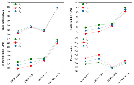 Poisson’s ratio (υ), ranging from −1 to 0.5, is usually used to evaluate the stability of the crystal structure against shear force. The greater the Poisson’s ratio, the better the plasticity. Compared with the Poisson’s ratio for the (TiCrNi)(AlFe), (TiCrFe)(AlNi), and (TiCrFe)(AlCr) atom occupancy positions, the obtained value of Poisson’s ratio VV-VR-VH for (FeCrNi)(AlFeTi) atom occupancy position is larger than (TiNiFe)(AlCr), and it has been shown that the plasticity of (FeCrNi)(AlFeTi) atom occupancy position is better (Figure 4). Furthermore, the ratio of bulk to shear modulus (B/G), i.e., Pugh’s ratio, can be used as a measure to determine the brittle and ductile nature of the material. The critical value separating ductility from brittleness is about 1.75. If Pugh’s ratio (B/G) comes out to be greater than 1.75, then the material will be ductile. In this paper, the (FeCrNi)(AlFeTi) atom occupancy position has the largest Pugh’s ratio (B/G = 2.53), respectively, indicating that the (FeCrNi)(AlFeTi) atom occupancy position is the best ductile. The inverse of Pugh’s ratio is called Frantsevich’s ratio (G/B). The calculated value of (G/B = 0.205) for the (FeCrNi)(AlFeTi) atom occupancy position is the smallest which also indicated ductility for this atom occupancy of alloy [43]. These results are in accordance with the conclusions of Poisson’s ratio discussed above. The variation of the atom occupancy position changes the mechanical properties of this alloy.