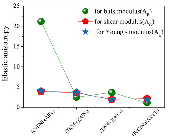 The elastic anisotropy of crystals plays an important role in that it results in the influence of multiaxial stress states on microcrack nucleation of materials [44]. The most widely used method for investigating elastic anisotropy is the percentage of elastic anisotropy for bulk modulus () and shear modulus () in polycrystalline materials by the following Equation [45]: . The value of 0 means that the crystal structure is the isotropy, while 100% suggests the maximum anisotropic of materials. The calculated results (Figure 5) for the percentage of elastic anisotropy in compression, shear, and young for (FeCrNi)(AlFeTi) atom occupancy position show that this alloy is isotropy, which indicates that AlCrTiFeNi presents an obvious elastic isotropic.
