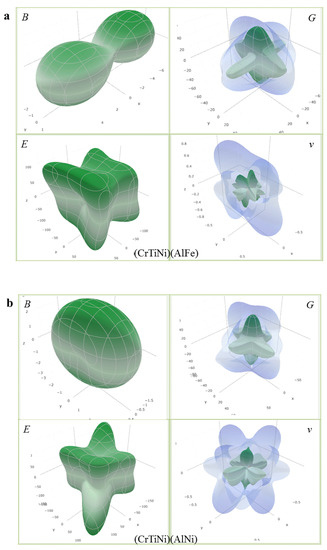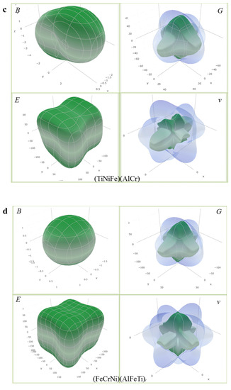 where () represent the direction cosines in the sphere coordination, () are the elements in the compliance tensor of AlCrTiFeNi alloy, which is the inverse of the elastic tensor (Cij). The calculated direction-dependent elastic modulus for AlCrTiFeNi of different atom occupancy positions is shown in Figure 5, which shows that (FeCrNi)(AlFeTi) atom occupancy position is isotropic, and the (FeCrNi)(AlFeTi) atom occupancy position is serious than others. These results were obtained using open-source software ELATE calculations [47]. Figure 6 is the calculated three-dimensional profile of the bulk modulus (B), shear modulus (G), elastic modulus (E) and Poisson’s ratio (ν) of single-phase AlCrTiFeNi with different atomic positions.