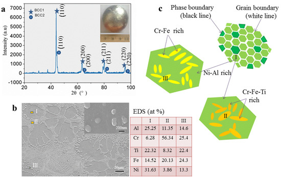 Based on the previous prediction of the crystal structure, we selected the AlCrTiFeNi alloy whose atomic composition is equimolar ratio for detailed experimental research. The X-ray patterns of the corresponding as-cast sample (Figure 7a) indicates that the bcc1 and bcc2 phases have microstructures with unit cell parameters of a = 2.9533 Å and a = 2.9250 Å, respectively. This crystal structure parameter is like the calculated lattice constants (a = 2.866) of (FeCrNi)(AlFeTi) atom occupancy positions, which indicates that the calculation is exceptionally reliable.