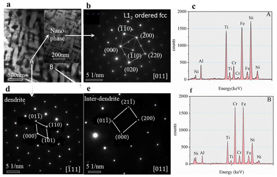The TEM bright-field image of the as-cast microstructure (Figure 8a) shows that dendritic (Figure 8d) and inter-dendritic (Figure 8e) structures (Selected Area Electron Diffraction pattern) with bcc1 and bcc2 phases, and the tiny Nano-phases distributed within the dendrites (Figure 8b) with size about 200 nm, the structure was L12 type ordered fcc phase. The calibration results showed that the lattice constant of the ordered Nanostructure is a = 5.8926 Å. Analysing the characteristics of the geometric relationship between the two sets of diffraction patterns, it can be concluded that the Nano-precipitate and crystal structure of inter-dendritic matrix satisfies the following phase relationship: (α represent the matrix of dendritic, α′ represent the matrix of nano-precipitates): , . The concentrations as shown in Figure 8c (obtained from TEM-EDS) indicate a small segregation of Fe, Ni, and Ti elements in the dendritic of matrix and Fe and Cr elements in the inter-dendritic. These small concentration variations indicate the presence of two types of phases, consistent with the results of XRD and SEM analyses.