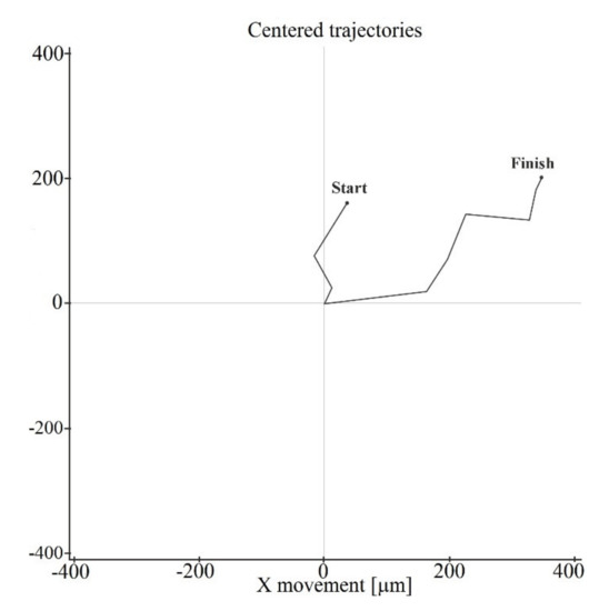 To analyze the cell morphology and motility, the digital microphotographs were taken each 45 min for 7 days. Figure 1 shows, that the cell moved along a complex trajectory with linear sections. During manual processing of digital videos, linear distances were evaluated by displacement of the cell nucleus due to significant variation in the shape and sizes (up to 100–400 µm in length) of migrating hAMMSC. The average linear velocity of free movement (ALVFM) of cells was determined before they formed cell-cell contacts.