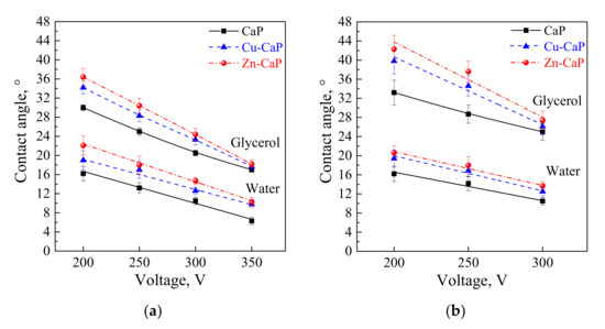 Table 1 represents data of the water and glycerol contact angles on the surface of the CaP, Zn-CaP, and Cu-CaP coatings on both substrates (Ti and Ti-40Nb) and data of the free surface energy. The low contact angles, that is below 44°, indicate high hydrophilicity for all coating types. An increase in the MAO voltage leads to a linear decrease of the water contact angles on all the coating types from 23° to 6° (Figure 2). The same negatively related regularities are observed for the glycerol contact angles on the Ti and Ti-40Nb substrates from 37° to 17° and from 43° to 26°, respectively. The previous article [34] showed that an increase in the applied voltage leads to a linear increase in the coating surface roughness and surface porosity (Table 1) which can be accompanied by a decrease in the contact angles with liquids. Furthermore, a growth in the size of structural elements and formation of monetite plate-like crystals with length up to 15 µm on the coating surface [34] promotes an increase of the specific area and, consequently, of the coating wettability. Figure 2 demonstrates that both substrates, modified with Zn and Cu coatings, are characterized by higher values of the water and glycerol contact angles compared with the CaP coatings, deposited at the same applied voltages. This behavior is possible due to the incorporation of the Zn2+ and Cu2+ metal ions into the CaP coatings which prevents wetting.