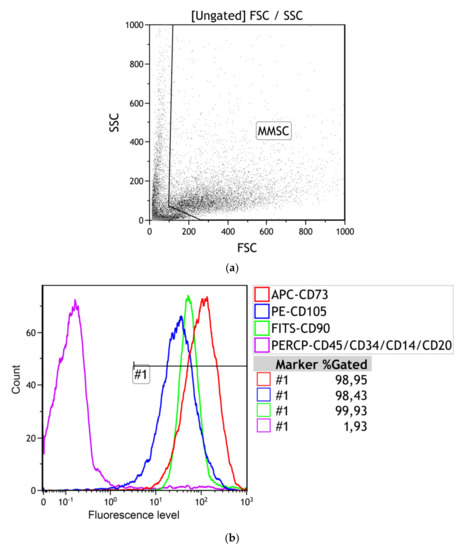 A strategy for gating live hAMMSCs. (a) MMSC identification based on forward scatter (FSC) vs. side scatter (SSC); (b) CD73+, CD90+, and CD105 + vs. CD14+CD20+CD34+CD45+.