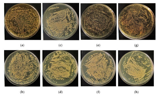 Photographs of a 24 h S. aureus culture in agar medium after 2 h pre-incubation with: (a) 0.9% NaCl (control 1); (b) RPMI-1640 (control 2); (c) extract of CaP coating on Ti; (d) extract of CaP coating on Ti-40Nb; (e) extract of Zn-CaP coating on Ti; (f) extract of Zn-CaP coating on Ti-40Nb; (g) extract of Cu-CaP coating on Ti; (h) extract of Cu-CaP coating on Ti-40Nb.