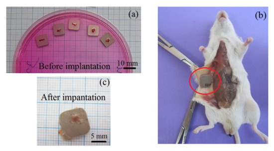 Photographs of the samples with in vitro applied bone marrow before implantation (a) and after 45-day subcutaneous implantation in vivo (b,c).