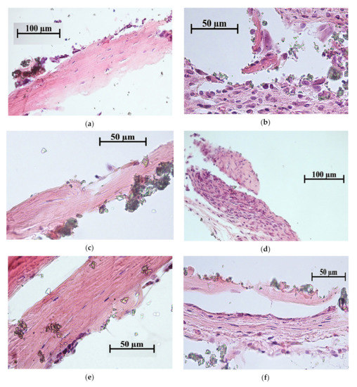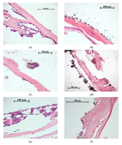 Histological composition of bone lamellae grown on the Ti substrate: (a,b) CaP coating; (c,d) Zn-CaP coating; (e,f) Cu-CaP coating. Bone with marrow (a,e), bone lamellae (b,c,f), and the sites of connective tissue ossification (d) are shown. Hematoxylin—eosin staining.