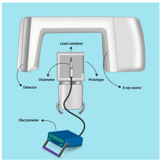 To evaluate the characterization and X-ray shielding properties of the fabricated prototype, a CBCT unit (NewTom VGi, Verona, Italy) and a recently calibrated Farmer type ionizing chamber dosimeter (Scanditronix Wellhöfer, Schwarzenbruck, Germany) were used. The distance between the X-ray source and the sensitive area of the dosimeter was fixed in all measurements. The prototype plates were attached to a lead container covering the dosimeter. The area of the sheets and the lead container could completely obscure the sensitive area of the dosimeter. The dosimeter assembly was placed on the chin rest of the CBCT unit (Figure 2). Exposure factors were 110 KVP, 3 mA, and 1.8 s (pulsed), and a field of view of 15 × 15 cm was selected.