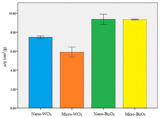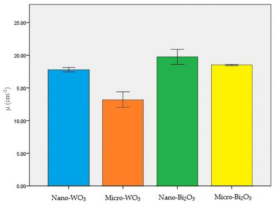 Nano-Bi2O3 showed the best shielding properties, followed by micro-Bi2O3. Nano-WO3 performed better in radiation attenuation compared to micro-WO3 (Table 2). Figure 4, Figure 5 and Figure 6 illustrate the linear attenuation coefficient, mass attenuation coefficient, and HVL of the fabricated prototypes.