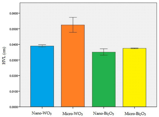 According to the relative efficiency formula for HVL of the samples, nanostructured WO3 sample was nearly 34% more efficient in attenuating radiation compared to the micro-structured WO3 sample (formula 4). This difference in nano- and micro-structured Bi2O3 was 6.5% (formula 5).