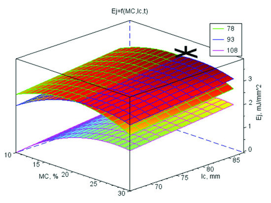 The increase in temperature caused changes in the physicochemical properties of the lignocellulosic compounds of WS, leading partially to the decrystallisation of particles. At higher MC, this caused a shift of the glass transition temperature towards lower values [27]. The moisture effect vs. temperature was more visible for pure WS. For the WS bonded with CC, it densified at the highest t of 108 °C. The characteristics of Ej for the CS and CC additives were different; the former was characterised by concavity with a minimum for the temperature of 108 °C and the latter by convexity with a maximum at 78 °C.