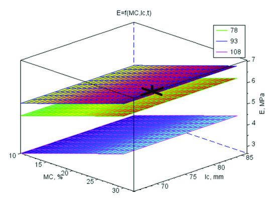 The surface chart of the elasticity modulus for pellet compression E vs. material moisture MC and die height lc for three material temperature levels t (78, 93 and 108 °C) with the marked highest point A = 4.00% wt/wt, MC = 30.0% w.b., lc = 71.0 mm, t = 88.5 °C, for which the optimal value of E is 6.77 MPa.